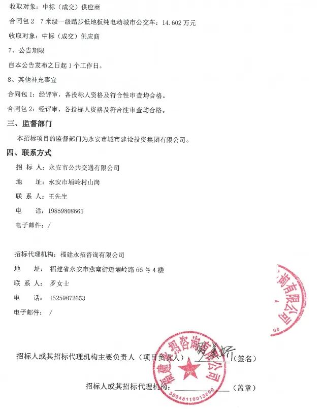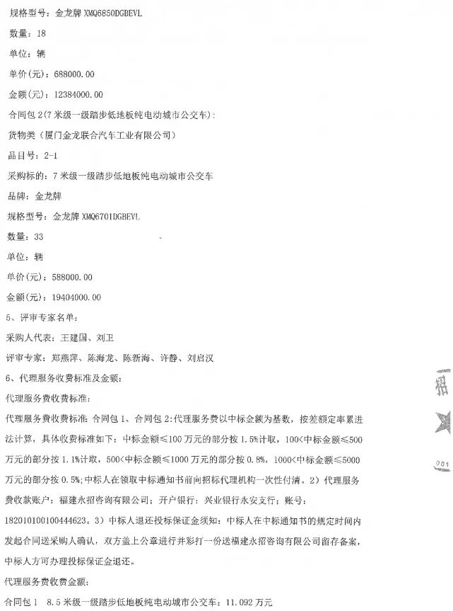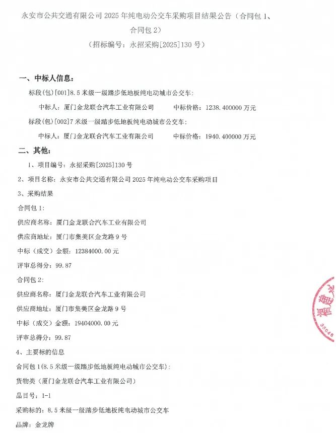 日前,永安市公共交通有限公司2025年纯电动公交车采购项目结果公告(合同包1、合同包2)发布。公告显示,合同包1、合同包2的中标人皆为厦门金龙联合汽车工业有限公司,中标价分别为1238.4万元、1940.4万元。